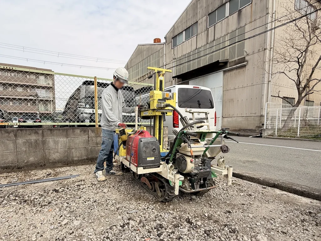 スクリューポイントを取り付けたロッドの先端に1kN(100kg)まで荷重を加えて、ロッドがどれだけ地中に貫入するかを諮ります。貫入が止まった後、ロッドに回転を加えて、さらに地中にねじ込み、25cmきざみに必要な回転数を測定し、その結果を基に地盤の強度を判断します。