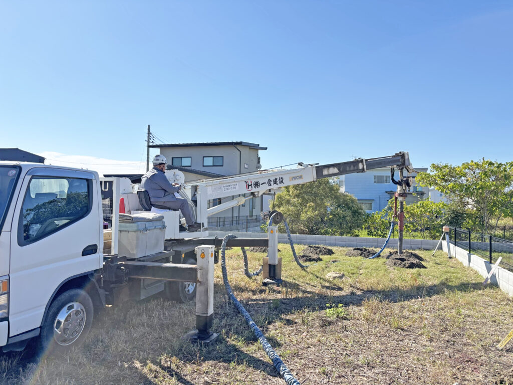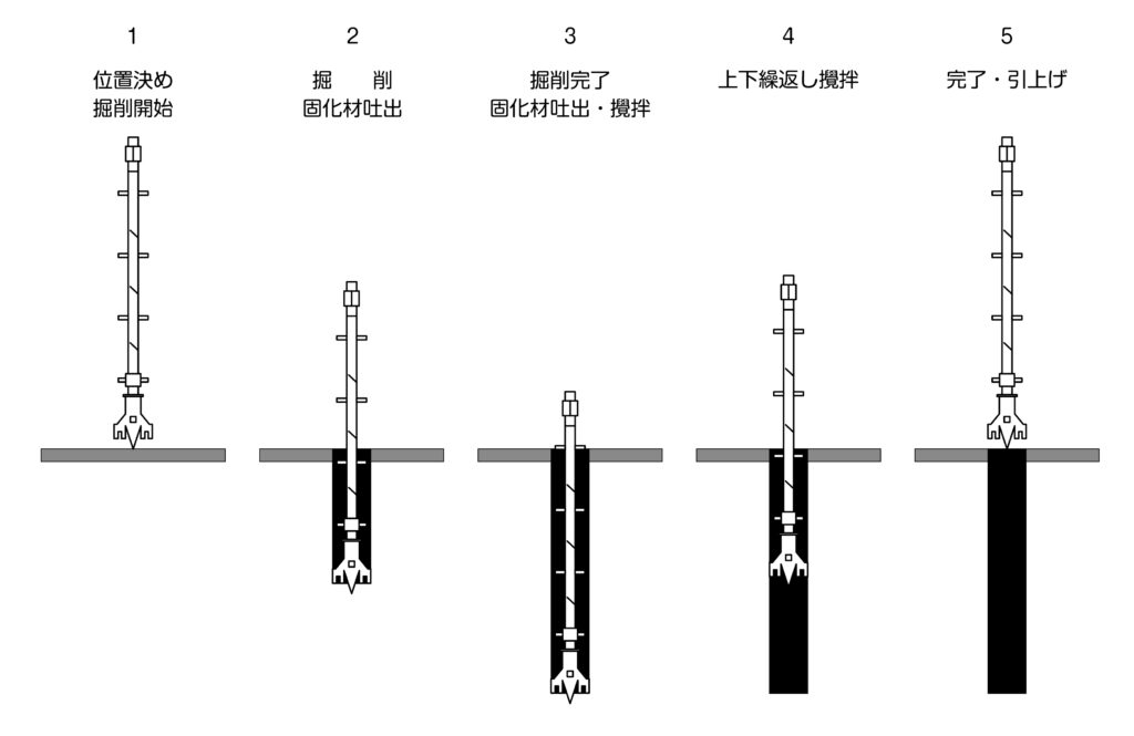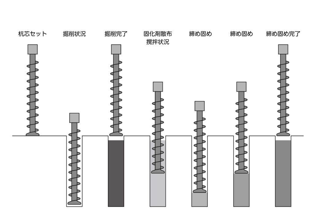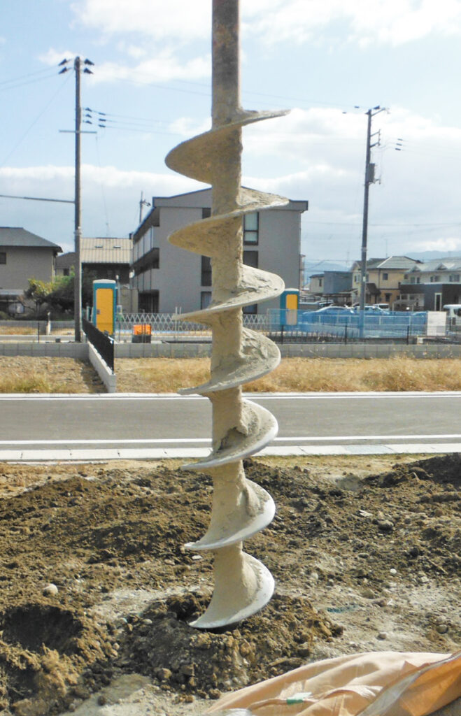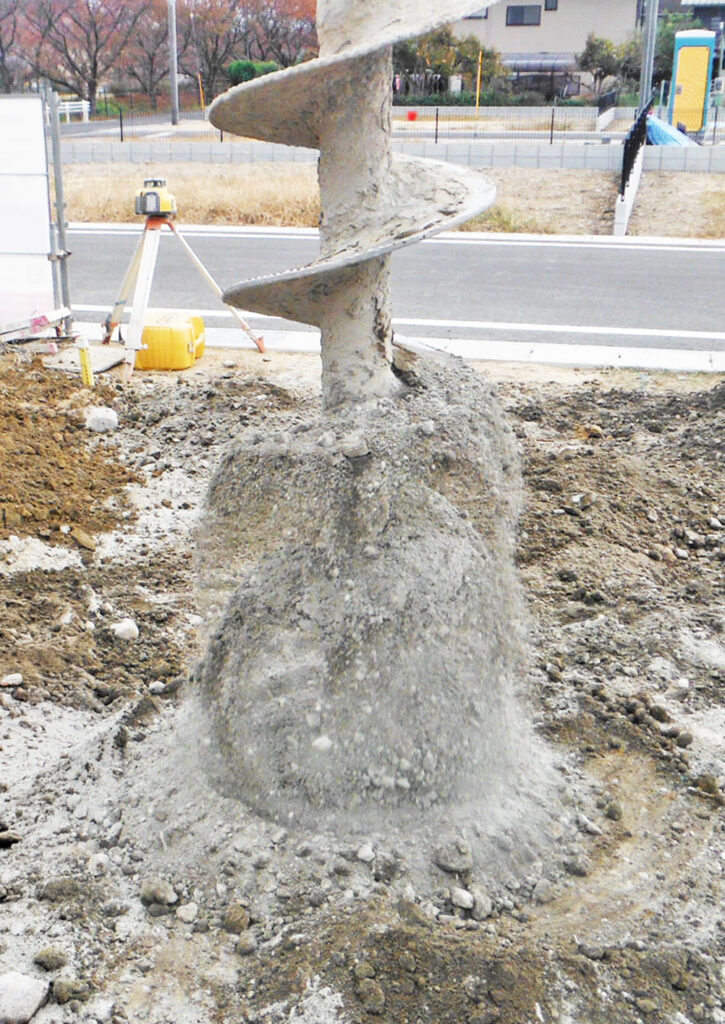 湿式柱状改良とは、セメント系固化材と水を混ぜたセメントミルクを、特殊な掘削・撹拌翼(かくはんよく)を使って地中に圧送し、現地の土と混ぜ合わせて固めることで、建物を支える円柱状の地盤改良を行う工法です。主に2m~8m程度の深さの軟弱地盤に適用され、振動や騒音が少なく、支持層が深くても、土質を選ばず低コストで施工できるのが特徴で、住宅建築で広く使われています。