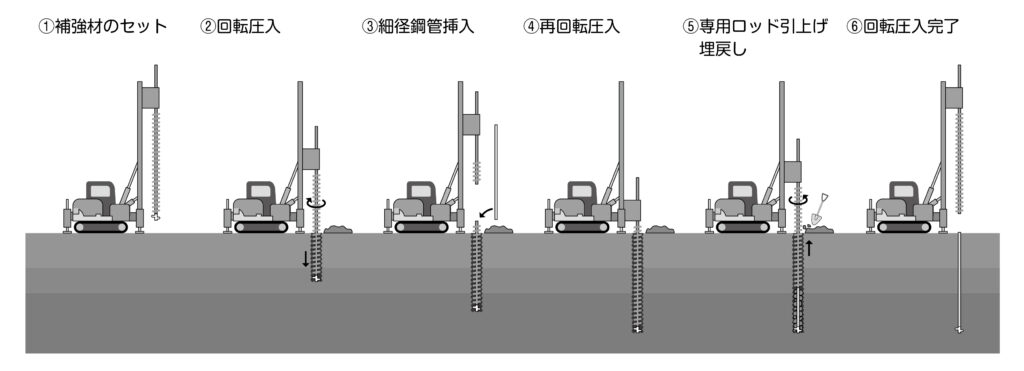 W-ZERO工法(ダブルゼロ工法)とは、残土を発生させず、補強材(先端ピースと細径鋼管)を撤去可能な、環境と土地の資産価値に配慮した画期的な地盤改良工法です。土地本来の力を活かし、杭を短くすることで経済的なスリム設計が可能となり、工事も短期間で完了する特徴があります。