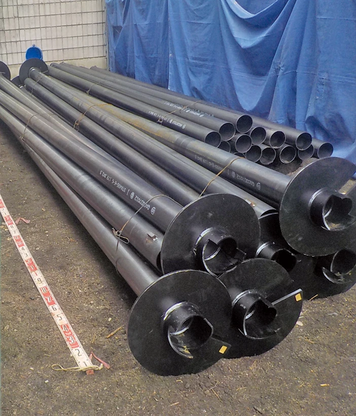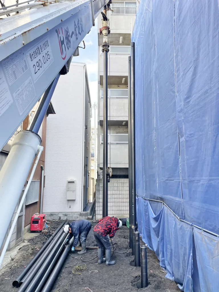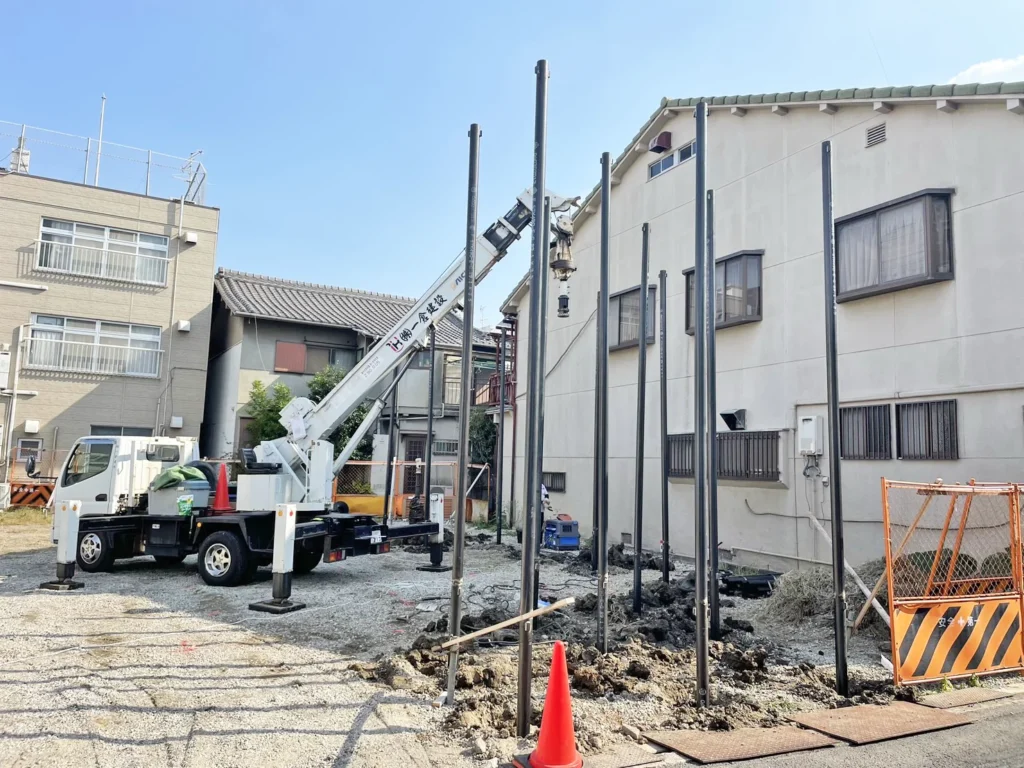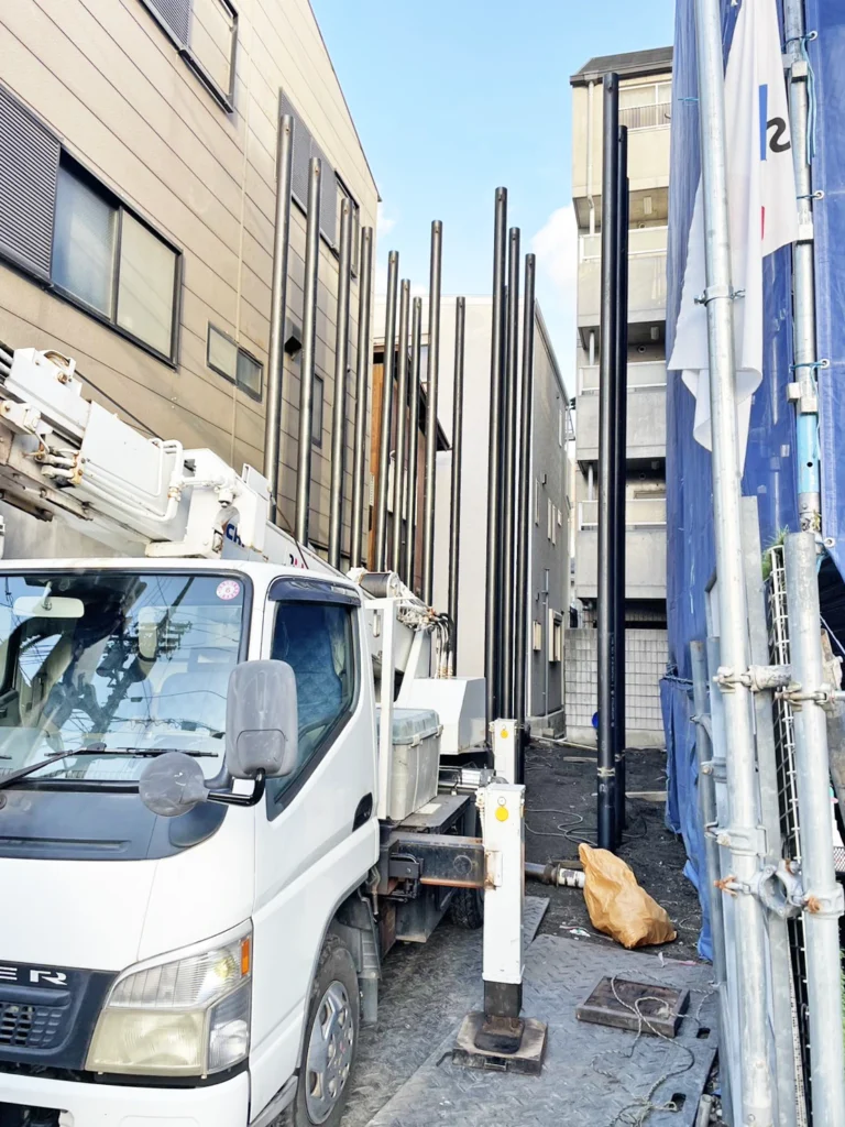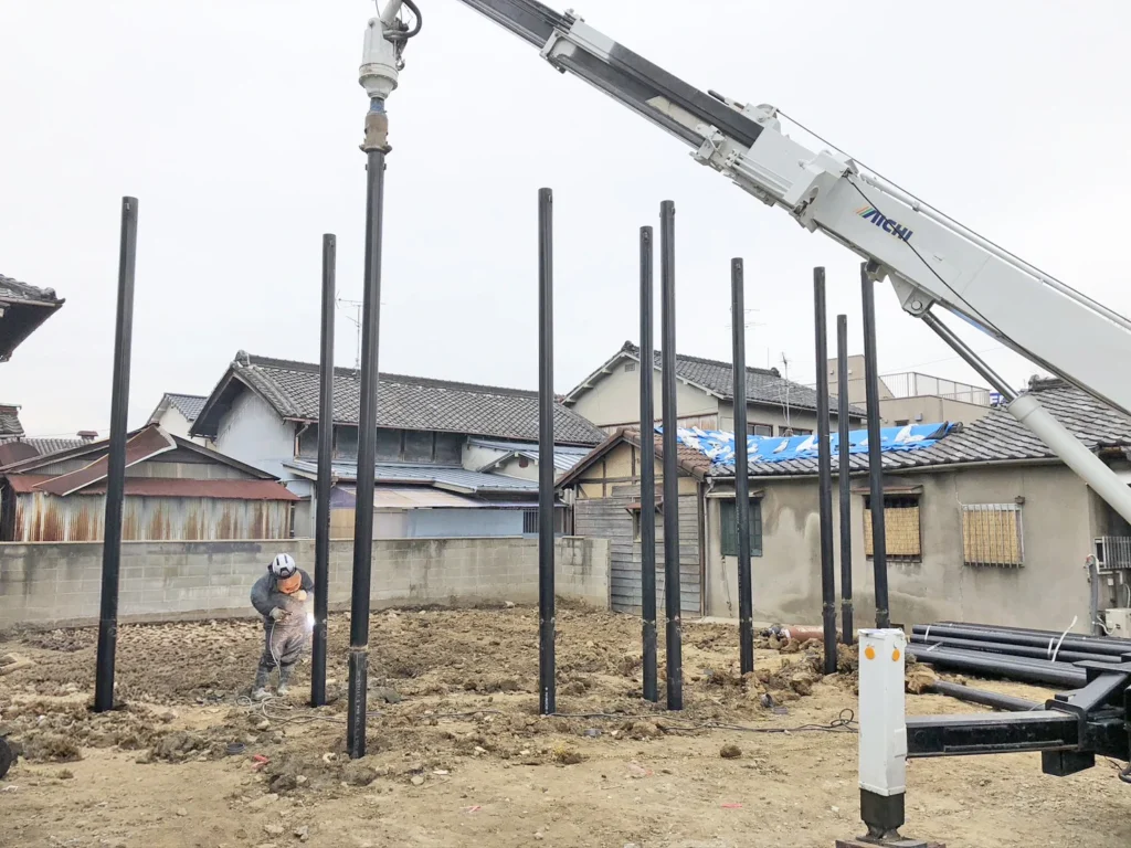 鋼管杭は軟弱地盤を強化する鋼製の杭で、建柱車(穴掘建柱車)は、クレーンと削孔(さっこう)装置を備え、この鋼管杭を地盤に回転貫入(ねじ込む)して打設するのに使われる多機能重機です。建柱車は小型で小回りが利き、狭い現場や省スペースでの施工、低振動・低騒音で環境に優しいのが特徴で、柱状改良に代わる工法として注目されています。